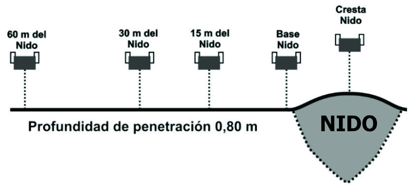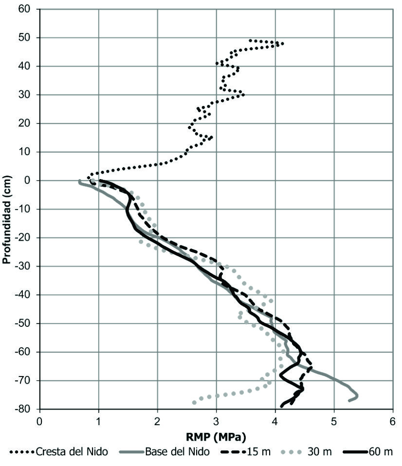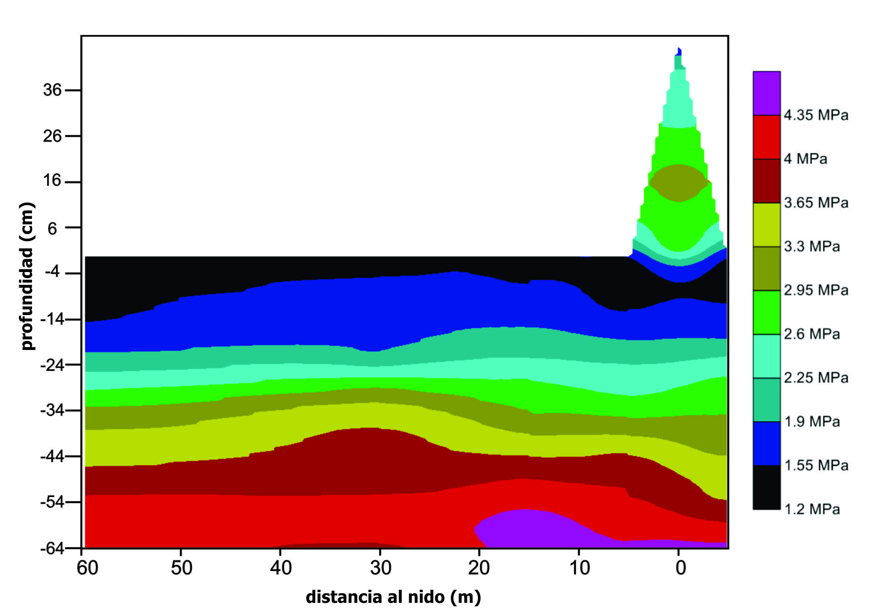 Las hormigas cortadoras de hojas (HCH) son ampliamente conocidas por ser “ingenieros del ecosistema” debido a las modificaciones que causan en los suelos al construir sus nidos. Determinamos la variación espacial de la resistencia mecánica a la penetración (RMP) del suelo generada por nidos de la HCH Atta vollenweideri en un bosque nativo del Espinal Mesopotámico. El estudio se realizó en el Área Natural Protegida “Estancia El Carayá” (Entre Ríos, Argentina). Se seleccionaron 10 nidos de A. vollenweideri donde se registró la RMP en cinco posiciones (centro del nido, periferia del nido, a 15, 30 y 60 m del nido) por medio de dos transectas de 60 m en cada nido, con dirección aleatoria. Luego se realizó una interpolación de cada penetración en un perfil longitudinal de isovalores de RMP, para lo cual utilizamos el método de ponderación de distancia inversa. La RMP aumentó ~30% a los 40 cm de profundidad del suelo sobre el centro de los nidos respecto a su periferia. Por otro lado, la RMP aumentó de forma considerable sólo en los primeros 10 cm de profundidad en el centro del nido. Los nidos de A. vollenweideri modifican las propiedades físicas de los suelos, sustrato que puede ser potencialmente empleado por otros organismos. Esto ilustra el papel de estas hormigas como ingenieros del ecosistema.